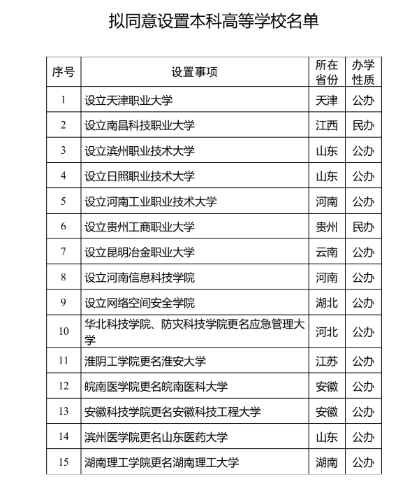 公示指出,根据《中华人民共和国高等教育法》《普通高等学校设置暂行条例》《普通本科学校设置暂行规定》《本科层次职业学校设置标准(试行)》等有关规定,经教育部党组会议审议,拟同意设置天津职业大学等15所学校,现予公示。