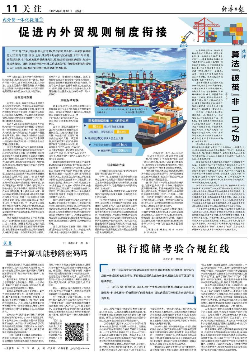 今年4月25日召开的中共中央政治局会议再次提出,加快推动内外贸一体化。推进内外贸一体化,离不开规则制度的充分衔接。各地在促进内外贸标准衔接、内外贸检验认证衔接、内外贸监管衔接、内外贸产品同线同标同质等方面,创新实践,不断探索。