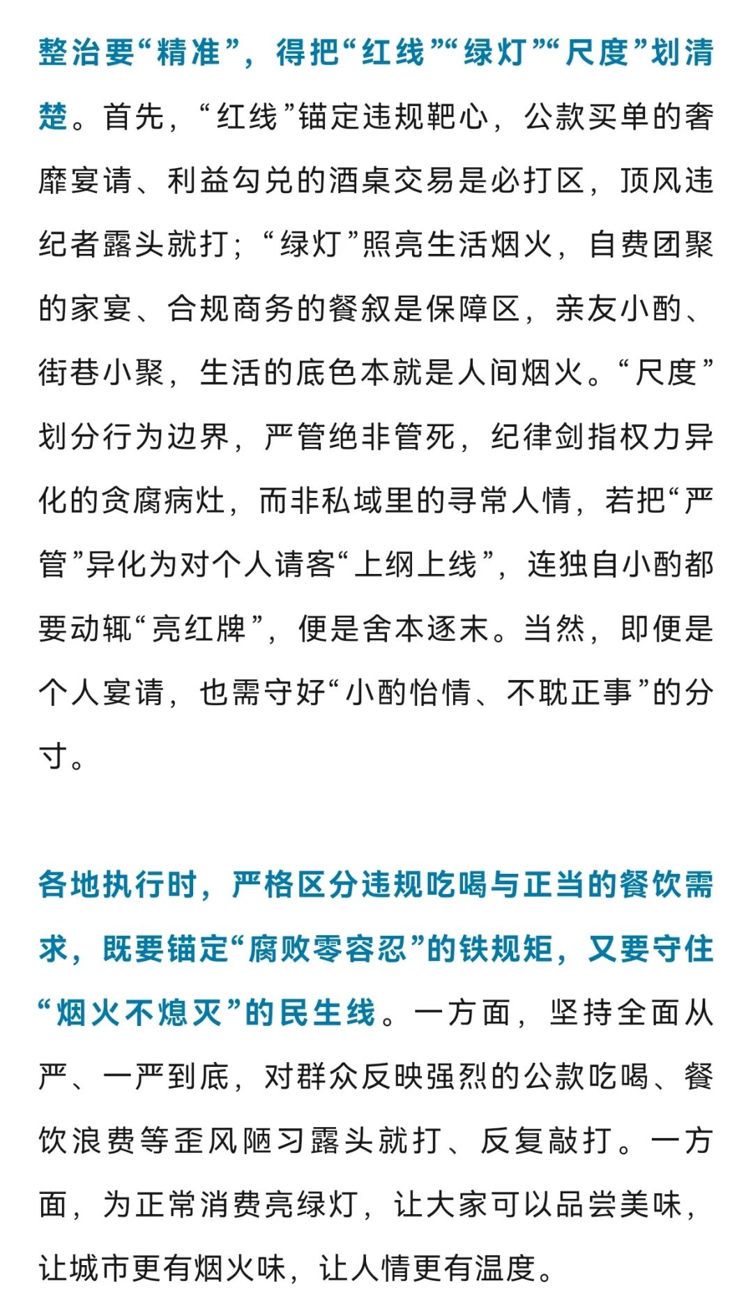 违规吃喝从来不是简单的“吃饭”,而是“四风”滋长的温床、腐败萌发的土壤——公款宴请藏着权力寻租,酒桌应酬裹着利益输送,“觥筹交错”间,纪律底线被瓦解,权力公信被侵蚀。党中央从八项规定破题抓党风廉政建设,正是以“小切口”撬动“大成效”,管住少数人的“嘴”,赢得的是千万百姓的“心”。这是刀刃向内的自我革命,更是民心所向的必然选择。