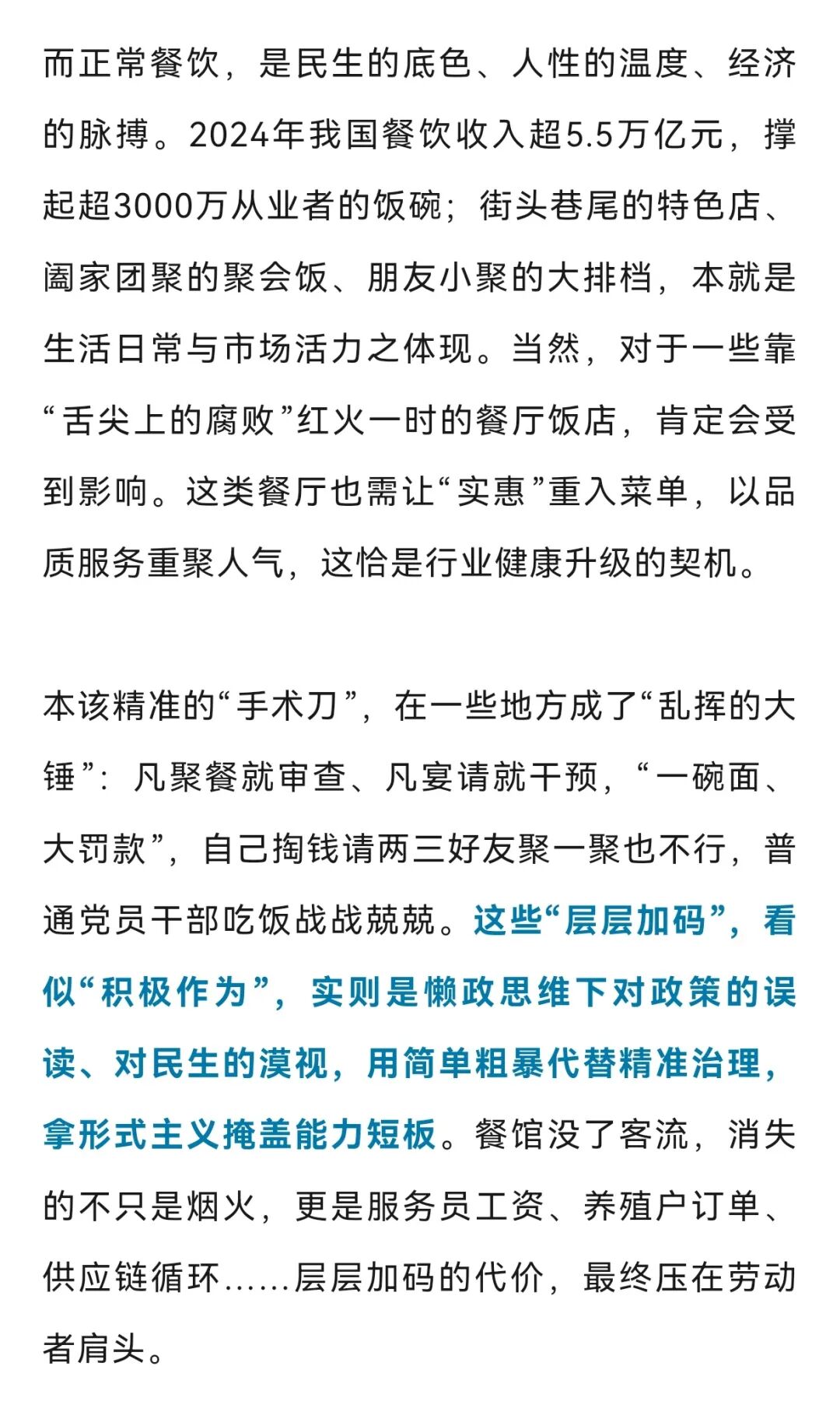 各地纵深推进违规吃喝专项整治,剑指权力寻租、公款滥用等沉疴,是正风肃纪的必然选择。但在执行链条中,个别地方“层层加码”,把“禁止违规吃喝”简单等同于“禁止吃喝”。这种行为也是懒政,是形式主义的变种,让商家失了生意,也让民生烟火黯淡。