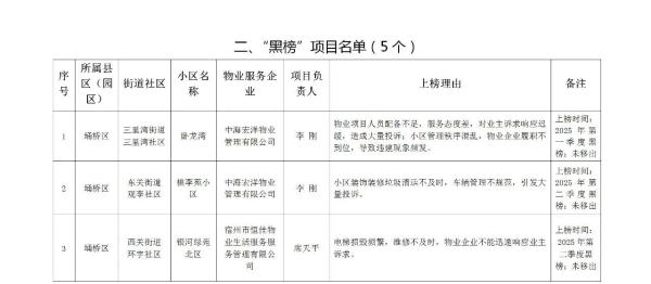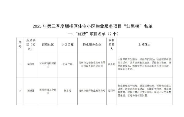 按市级物业工作考核要求,各县区、园区每季度进行评选,发布住宅小区物业服务项目“红黑榜”,根据各街道评选情况,综合日常监督管理、信访投诉处理等情况,现将汇金广场、临水苑2个项目列入“红榜”;卧龙湾、桃李苑小区、银河绿苑北区、丽水苑、中华园5个项目列入“黑榜”,并予以通报。