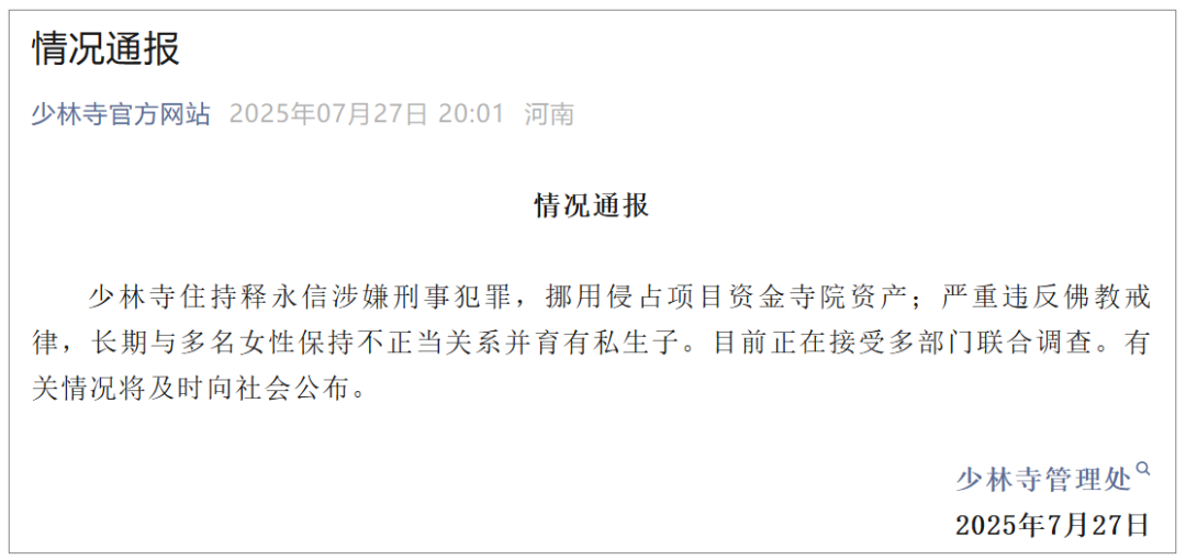 少林寺住持释永信涉嫌刑事犯罪,挪用侵占项目资金寺院资产;严重违反佛教戒律,长期与多名女性保持不正当关系并育有私生子。目前正在接受多部门联合调查。有关情况将及时向社会公布。